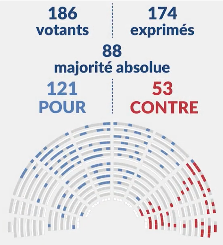 Le RN a voté contre (sur 120 élus, ils étaient 53 présents), la France insoumise qui avait voté majoritairement contre il y a un mois s’est abstenue cette fois… 91 députés du groupe macroniste de Gabriel Attal « ensemble pour la république » ont voté pour ainsi qu’une majorité des démocrates (macronie) dirigés par Marc Fresnau avec 21 pour, et la moitié des socialistes (37 pour).